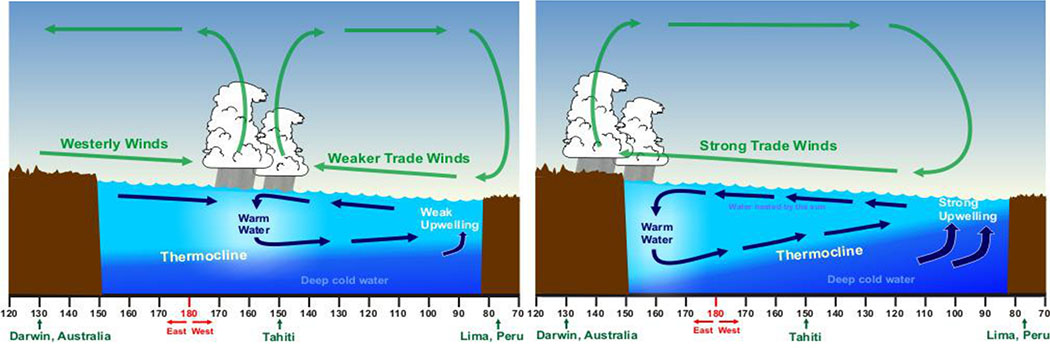 The weakening of the trade winds causes warm western Pacific waters to flow back into the colder central and eastern Pacific basins. This build-up of warm water in the eastern Pacific transfers heat high into the atmosphere through convection, generating thunderstorms. The shift in warm water affects where thunderstorms occur, which is described as the “first atmospheric domino to fall” in the El Niño cycle.