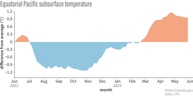 As of June 2023, an El Niño event has been declared and is underway. It is expected to fuel tropical cyclones in the Pacific, boost rainfall, and increase flood risk in parts of the Americas and elsewhere. The last time a strong El Niño was in full swing, in 2016, the world saw its hottest year on record, and similar record-high temperatures are expected this year.